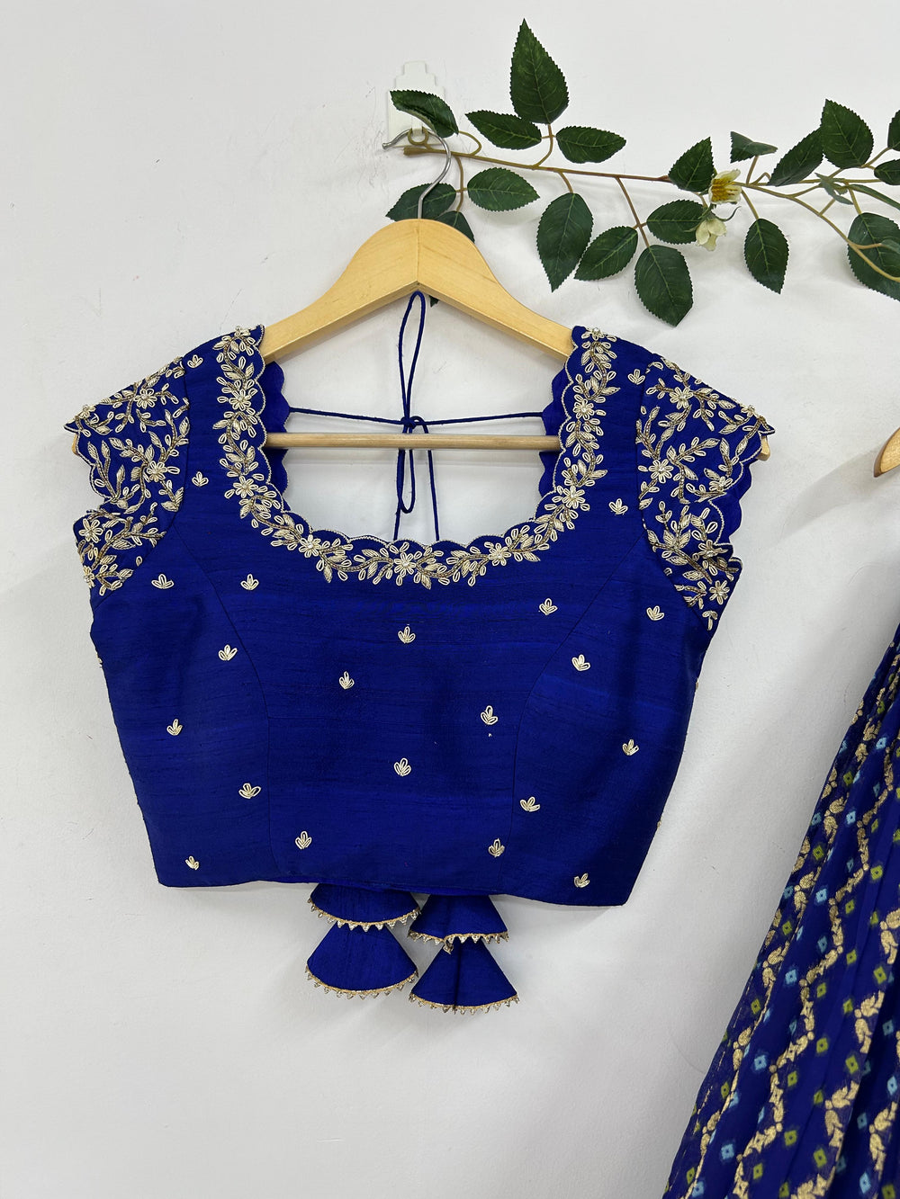 This Pure Bandani lehenga is made from Georgette base Bandani and it comes with a pure 100 gm raw silk blouse with handwork done on front, back and sleeves. It also comes with a chinnon dupatta with all over buttis on it.
