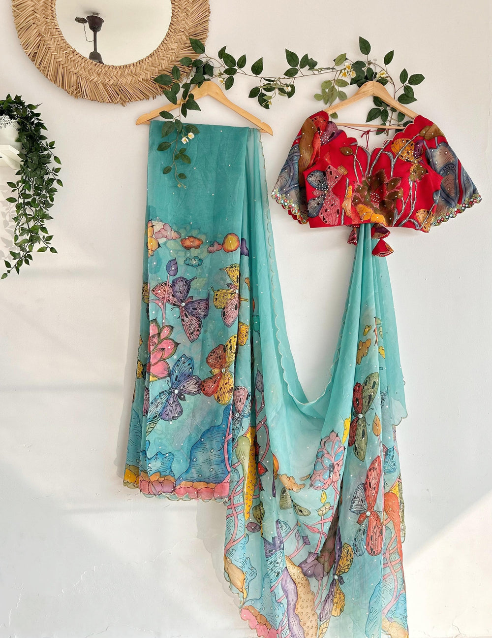 This Saree is a pure hand painted pen kalamkari saree custom made and comes with handwork on it a hand painted pen kalamkari blouse with complete handwork on it as well.
