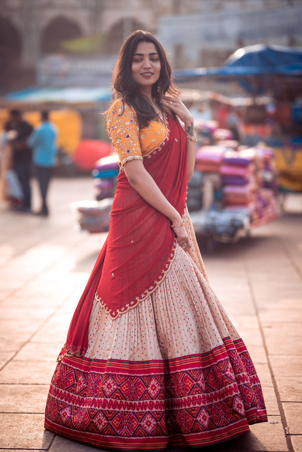 Opting for contrasting colors between the crop top and skirt creates an eye-catching look. To preserve the patola, wrap it in a muslin cloth before storing it and iron it on low heat.