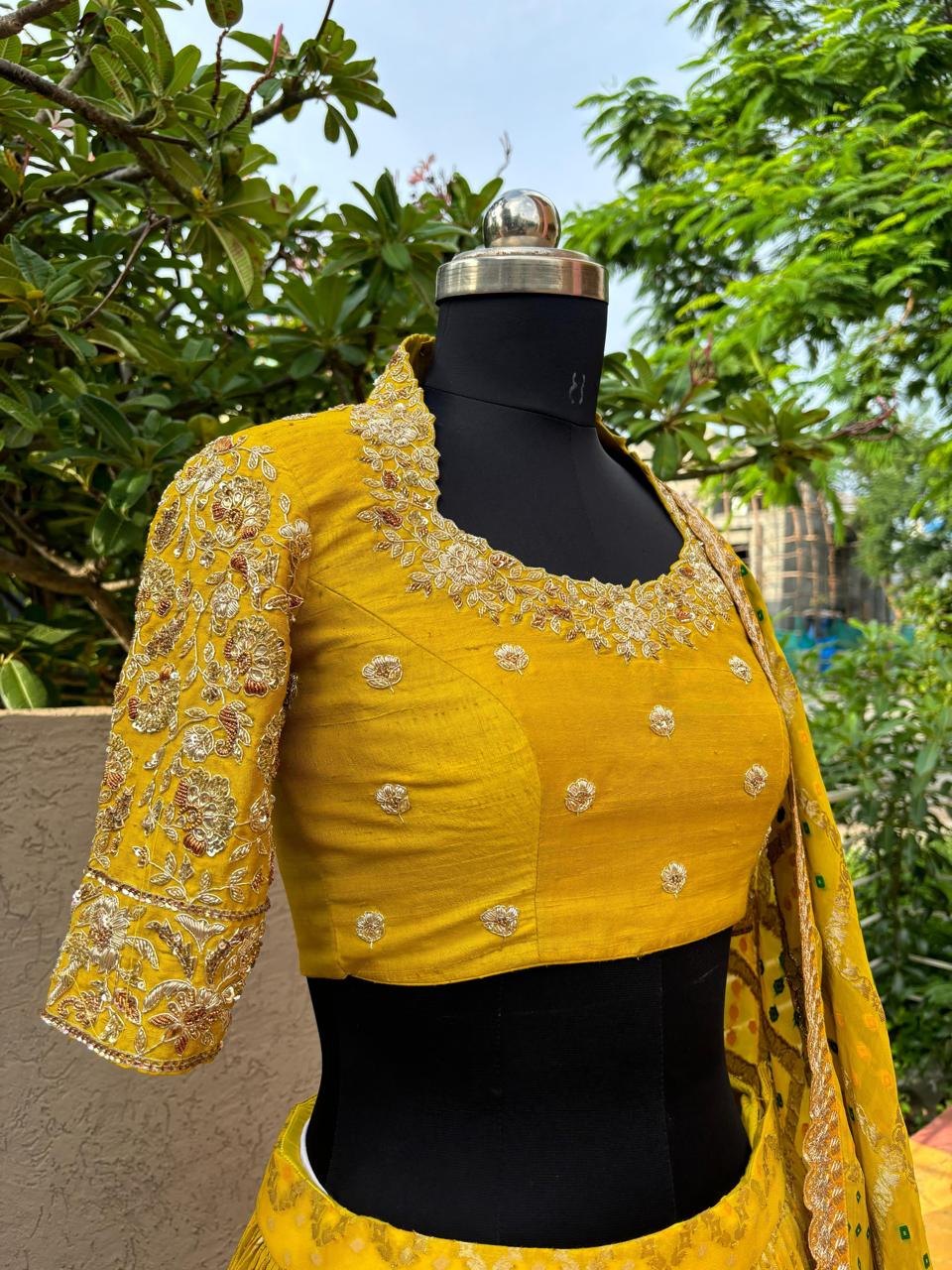 This Yellow Pure Bandhani half sarees comes with a complete handwork done pure Raw Silk blouse and a pure Georgette based Bandani silk lehenga along with a beautiful contrast bandani dupatta with zari border.