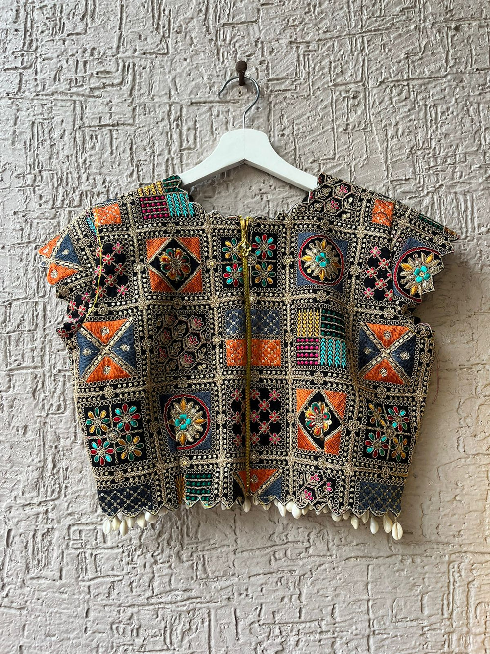 This crop top lehenga is a perfect fit for a Haldi & a Sangeet event. The top comes with heavy embroidery work and the lehenga is made from chinnon. It also comes with a chinnon dupatta.Â