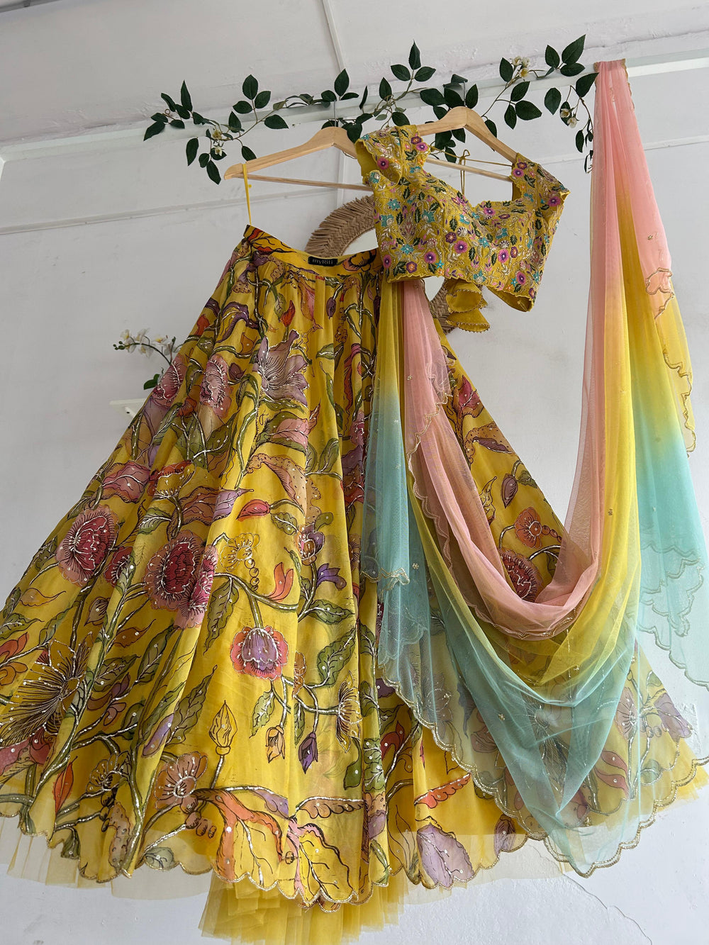 Yellow Organza Silk Pen Kalamkari Lehenga