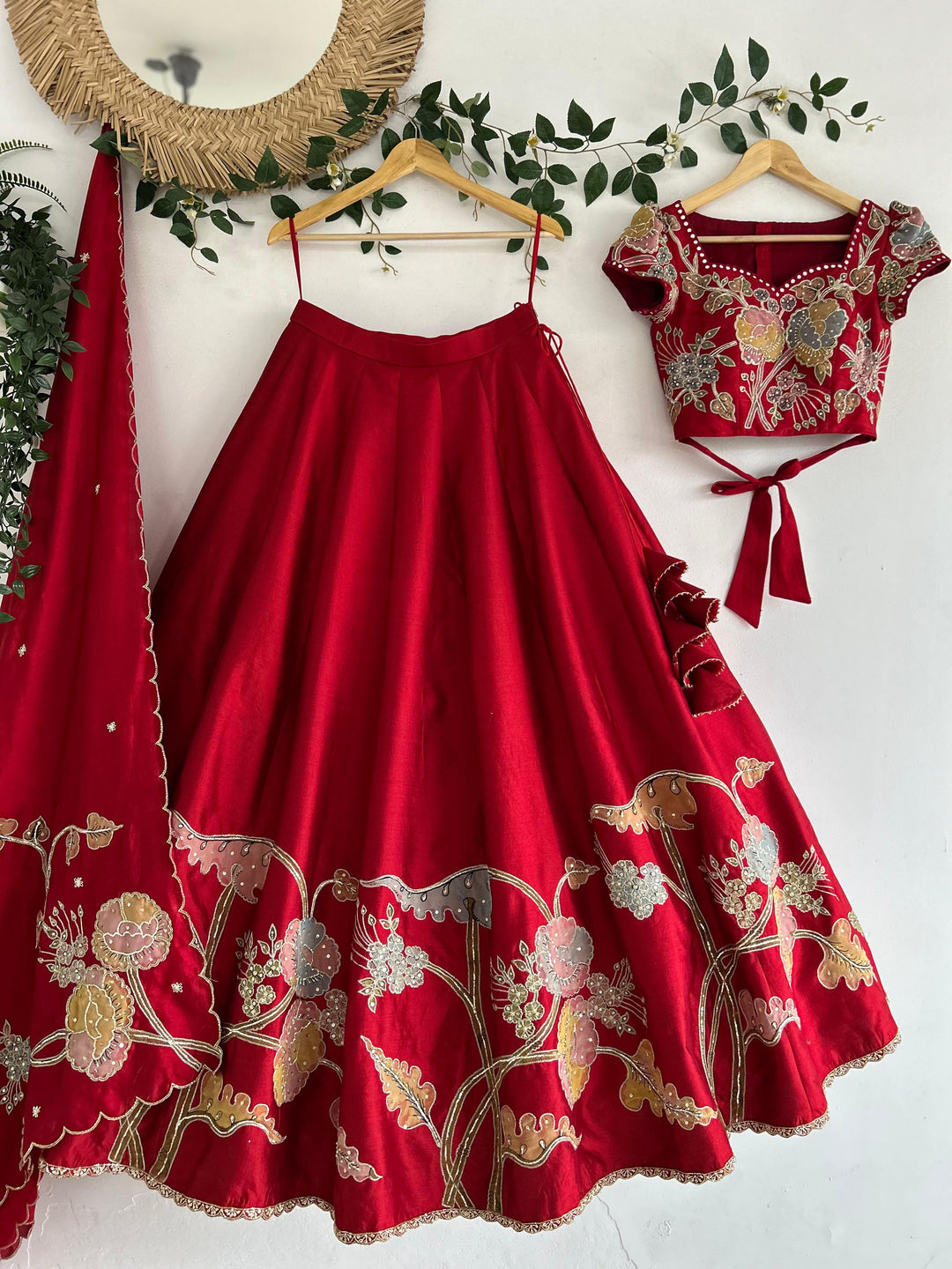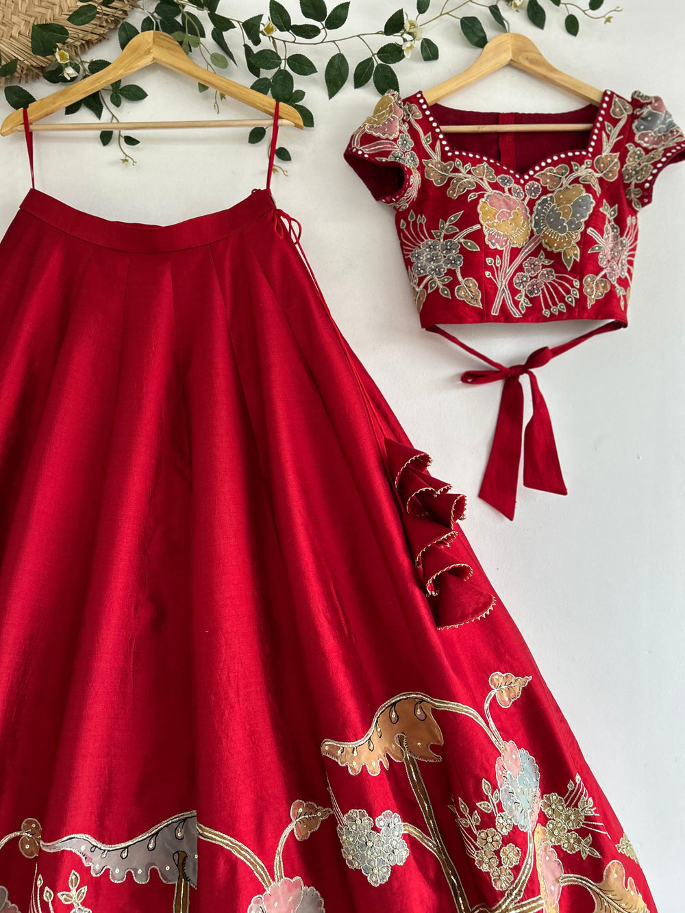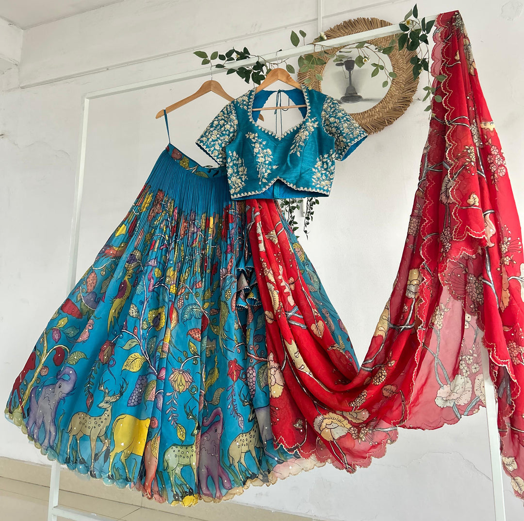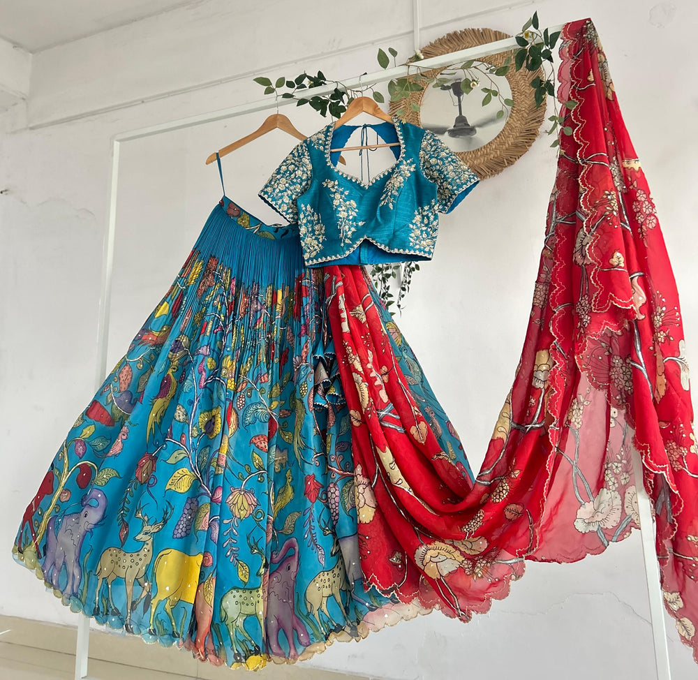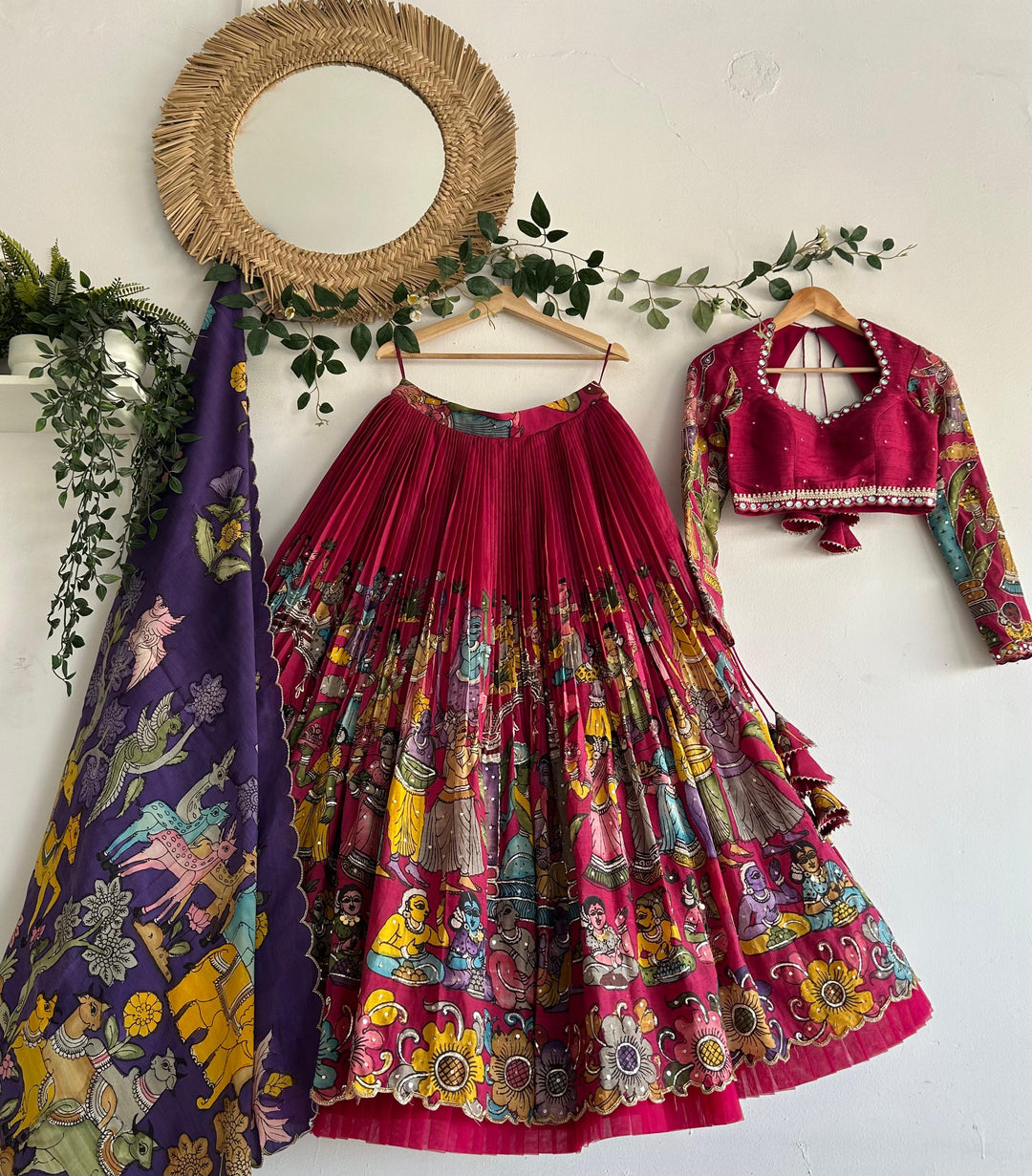 From the vibrant hues of the Pink Kalamkari Silk Lehenga to the soothing tones of the Blue Kalamkari Lehenga, our collection offers a spectrum of choices for every occasion. The fiery elegance of the Red Kalamkari Lehenga and the serene beauty of the Green Kalamkari Lehenga are bound to leave an impression.