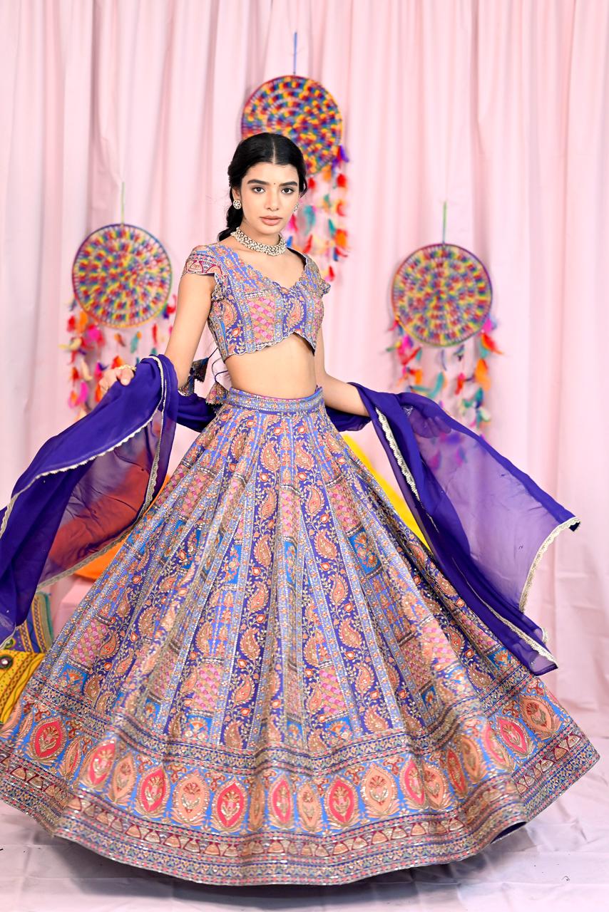 Blue & Peach Silk Lehenga