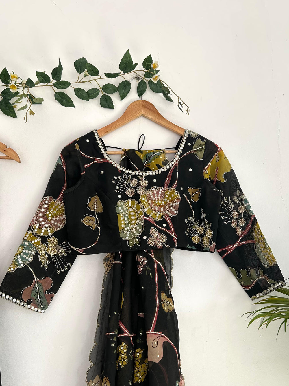This Saree is a pure hand painted pen kalamkari saree custom made and comes with handwork on it a hand painted pen kalamkari blouse with complete handwork on it as well.