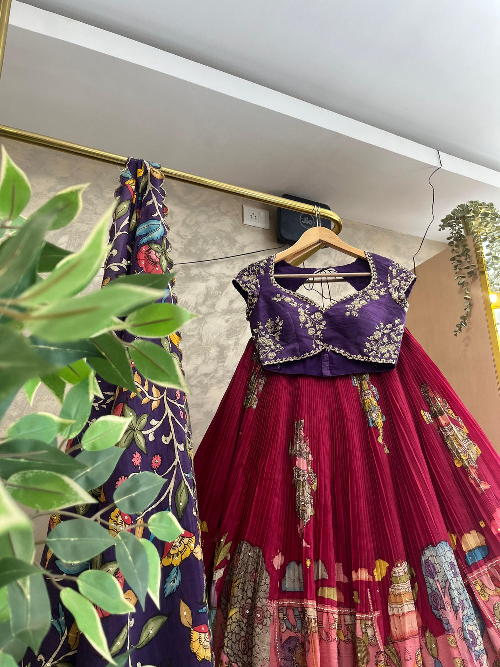 This outfit is a pure hand painted pen kalamkari done on a Bangalori silk fabric. It comes with a pure 100 gm raw silk handwork top on it along with a pure hand painted pen kalamkari lehenga which also has handwork engraved on it. The dupatta is a pure hand painted pen kalamkari silk dupatta.