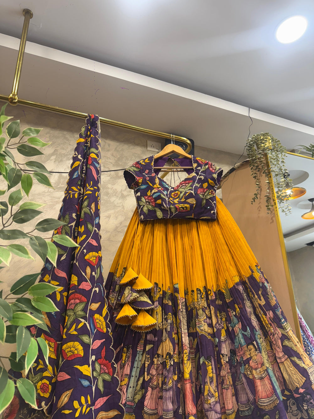 This outfit is a pure hand painted pen kalamkari done on a Bangalori silk fabric. It comes with a top with handwork done on it. The dupatta is a pure hand painted pen kalamkari dupatta.