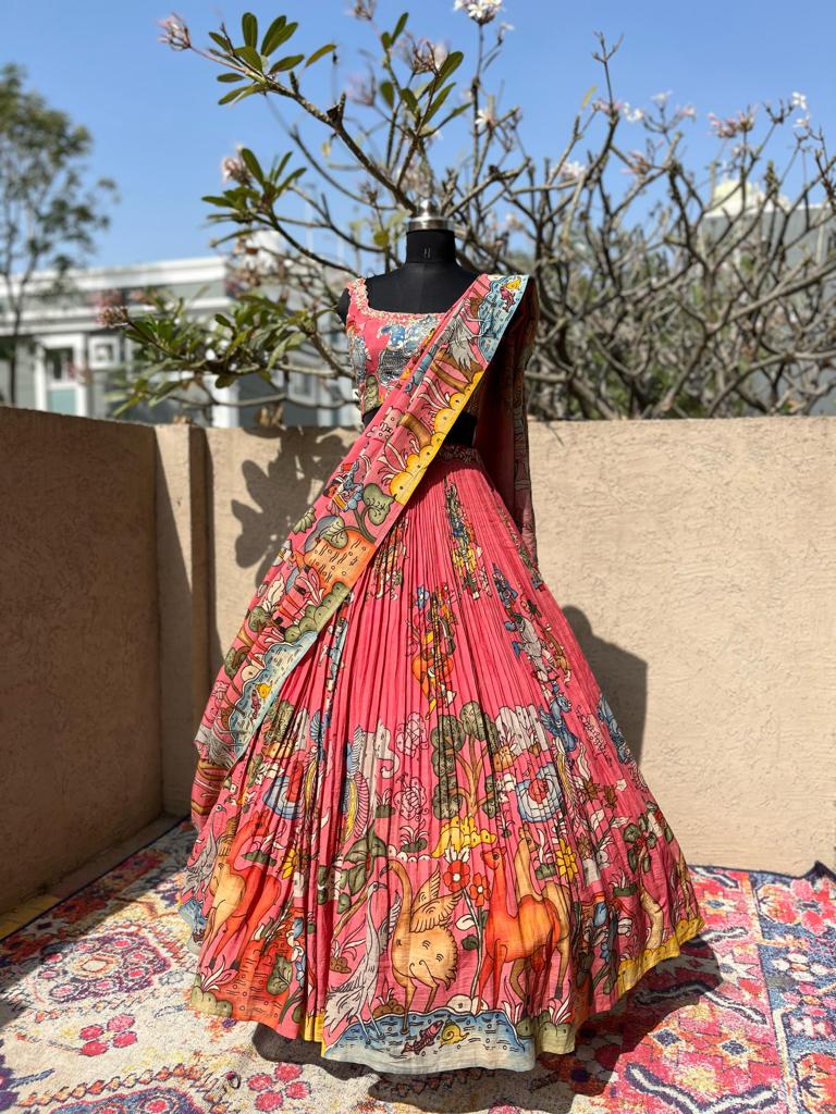 Step into a world of vibrant elegance with the Peachish Pink Kalamkari Silk Lehenga from myRiti, a must-see in our Online Lehengas collection. This beautiful half saree comes with pure handwork pen Kalamkari design on it. The top is made from pen kalamkari and comes with handwork on Front neck and back. It comes with a pure pen kalamkari work lehenga and a dupatta. This bright-colored beautiful lehenga is going to be a go-to pick for any festive occasion.