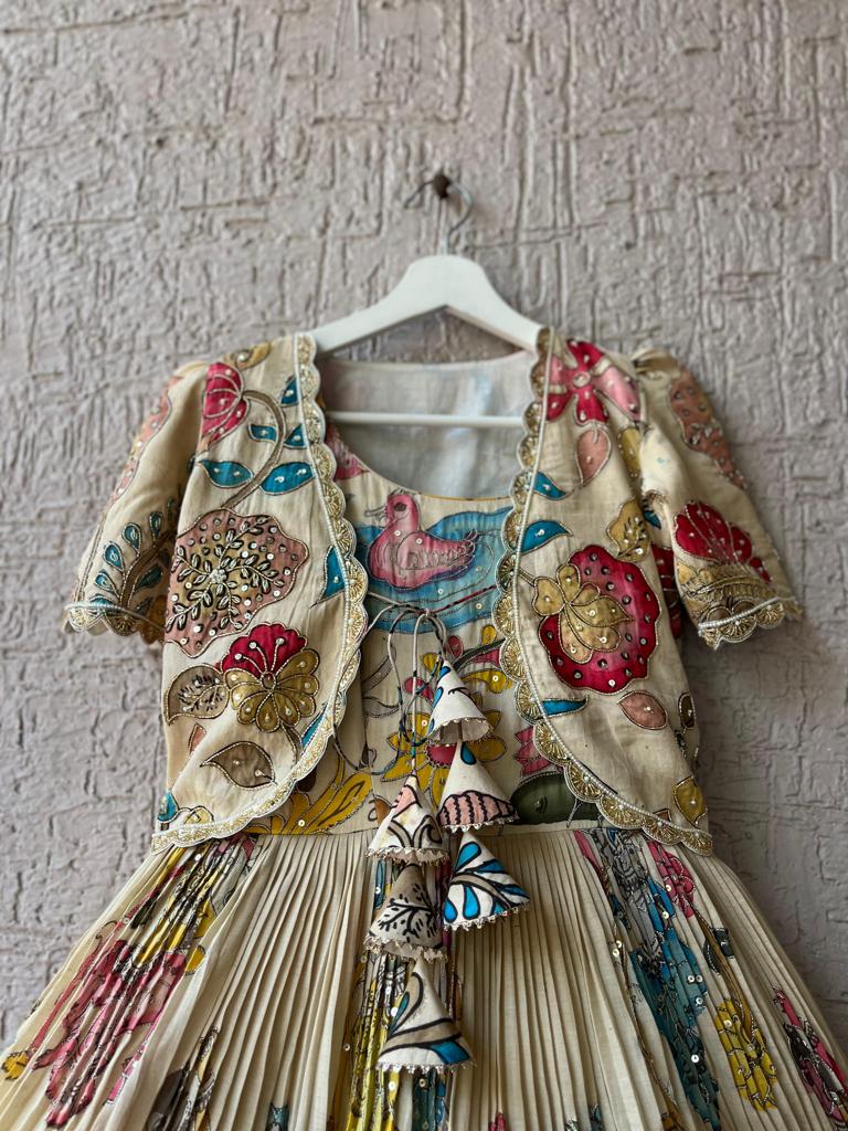 Immerse yourself in the splendor of the Pen Kalamkari Silk Dress, exclusively available at myRiti's Online Dresses collection. This beautiful long dress is made from pure hand painted kalamkari design on bangalori silk fabric . This bright-colored beautiful lehenga is going to be a go-to pick for any festive occasion.