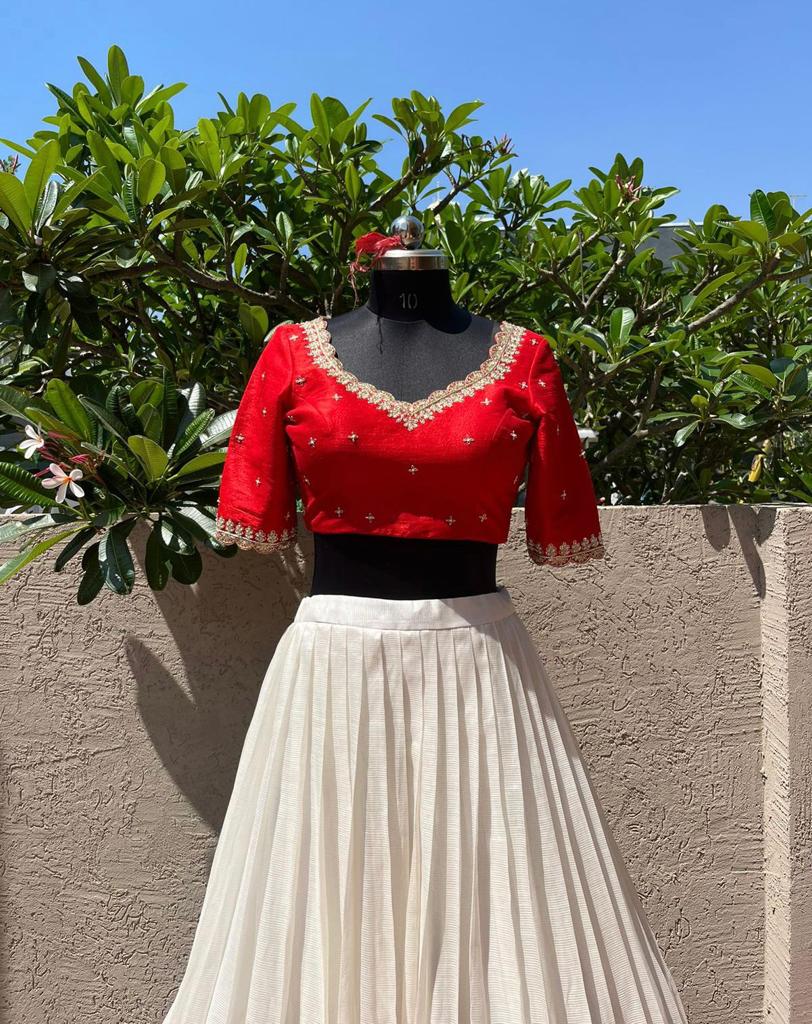This outfit is made from pure mangalgiri silk handloom fabric. Top is made from pure raw silk with extremely rich handwork on front and sleeves of the top. White color lehenga with silk border. This bright-colored beautiful lehenga is going to be a go-to pick for any festive occasion.Â
