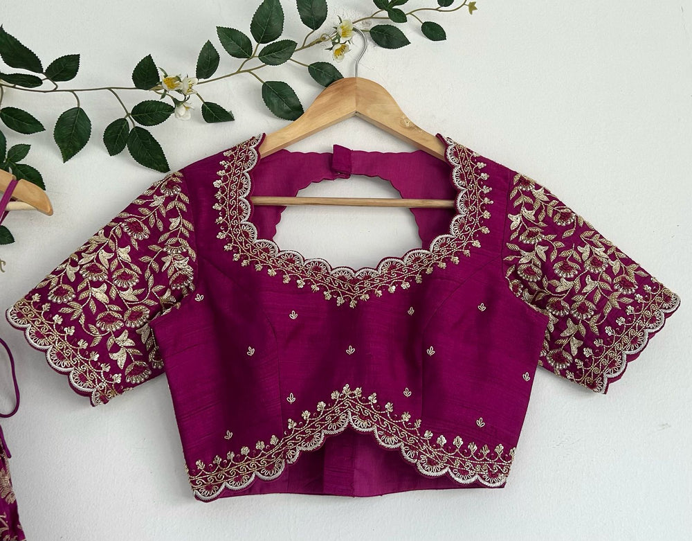 Discover the epitome of grace and elegance with our "Wine Banaras Silk Lehenga," exclusively at www.myriti.com. This outfit is made from rich banarasi silk fabric. Top is made from raw silk silk with extremely rich handwork on front and sleeves of the top. This silk lehenga comes with a rich Banarasi zari border. The dupatta is a chinnon flowly dupatta.