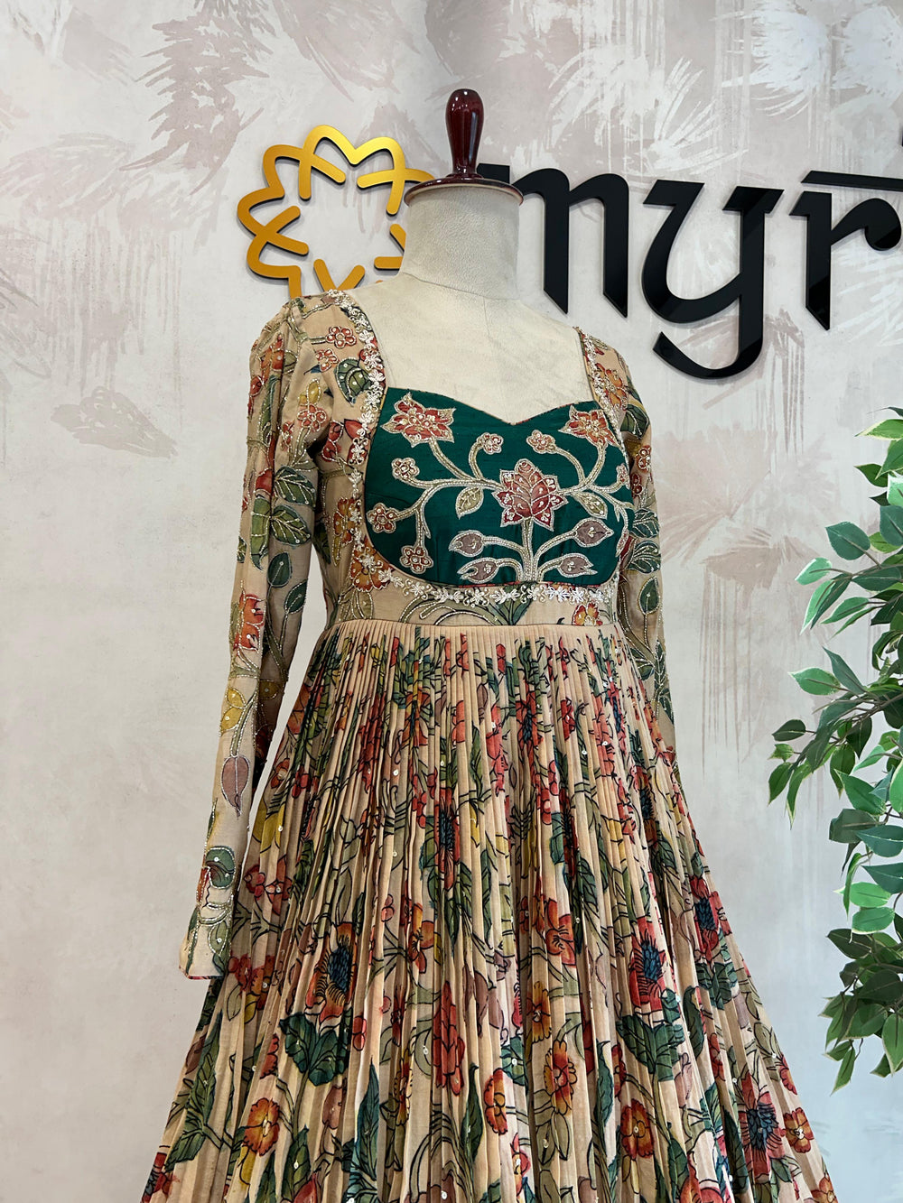 This beautiful long dress comes is made with a pure pen kalamkari hand painted fabric with highlighting work done on the complete outfit.