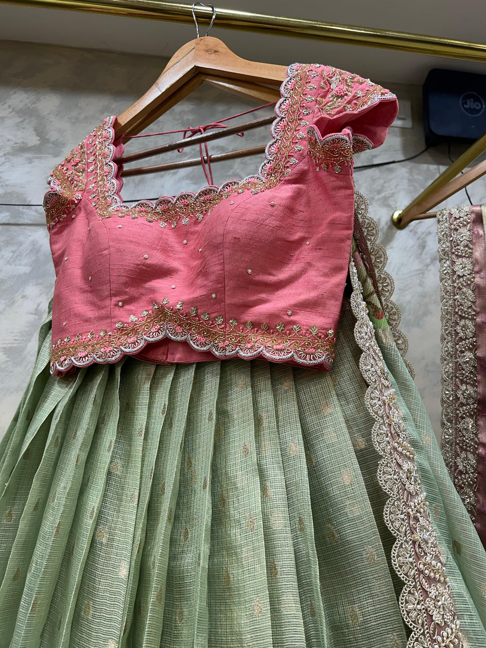 This lehenga is made of rich Kota silk fabric and comes with a 100gm pure raw silk top with maggam work on it. This outfit comes with a kota silk dupatta with a heavy border attached to it. This bright-colored beautiful lehenga is going to be a go-to pick for any festive occasion.