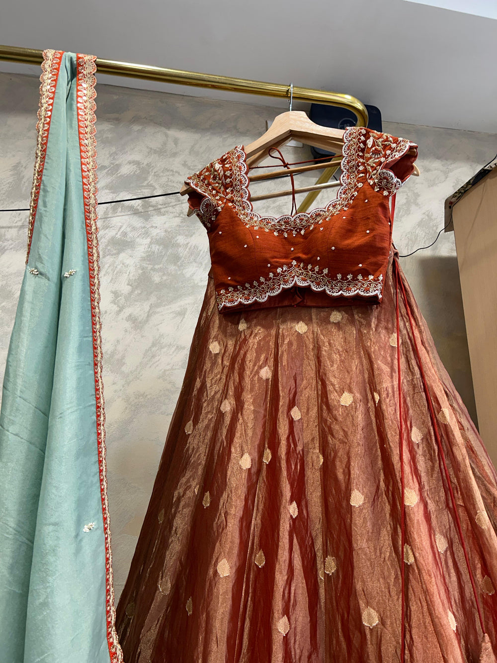 This beautiful crop top lehenga comes with complete handwork done Raw silk top along with a rich tissue lehenga. This lehenga is a pure tissue silk with a rich handwork border added to it. The dupatta is a pure dupion silk dupatta with 4 sides border attached on it.