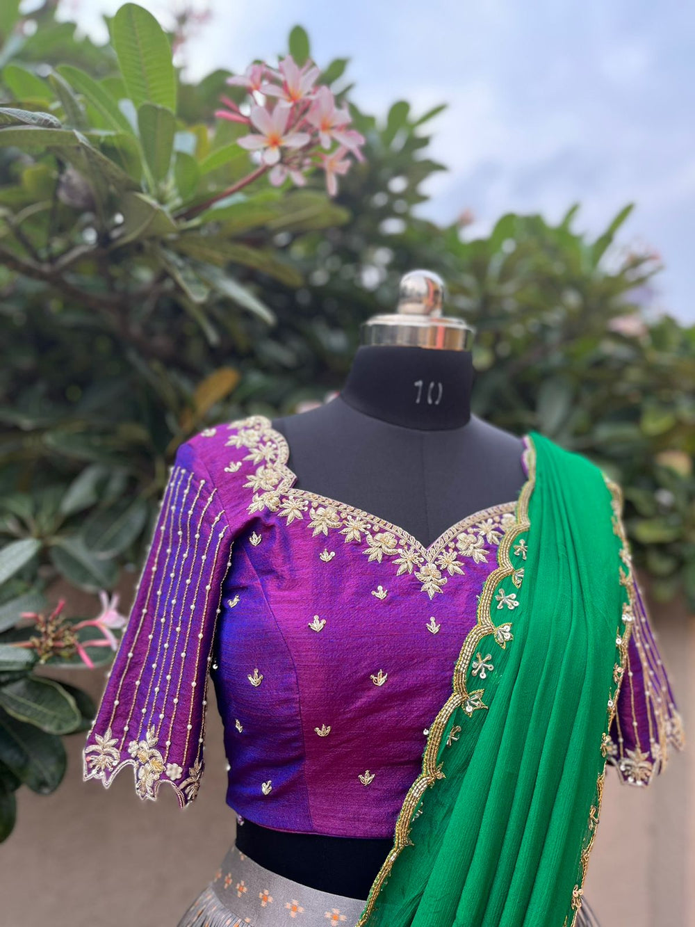This half saree lehenga comes with handwork on Front Top and Sleeves along with a Bandani design Patola border lehenga with a handwork chinnon dupatta.