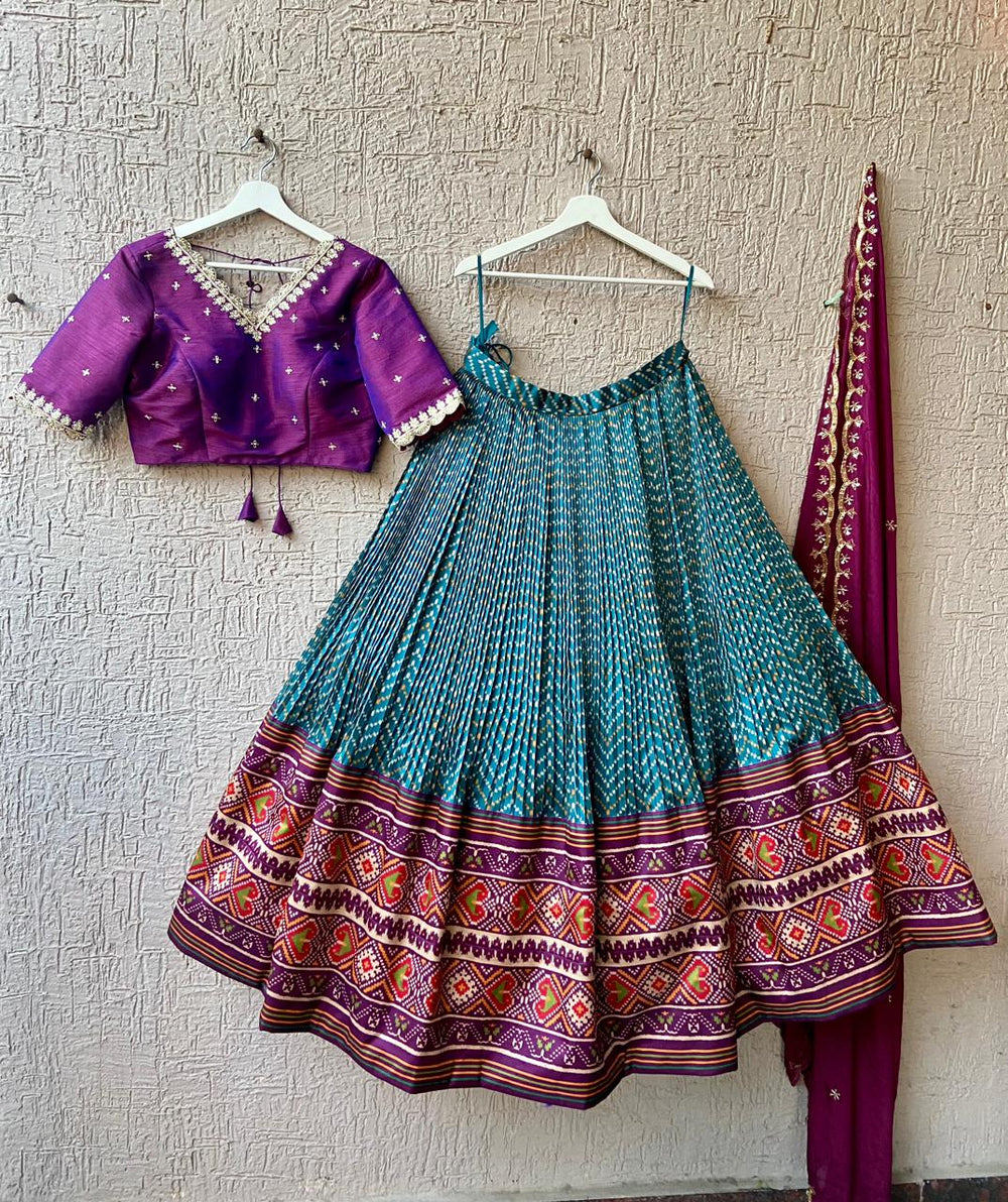 This outfit is made from Tussar Silk fabric with Patola design on it. The top comes with handwork on front neck and sleeves and the lehenga with small pleats. It comes with a pure chinnon handwork dupatta. This bright-colored beautiful lehenga is going to be a go-to pick for any festive occasion.