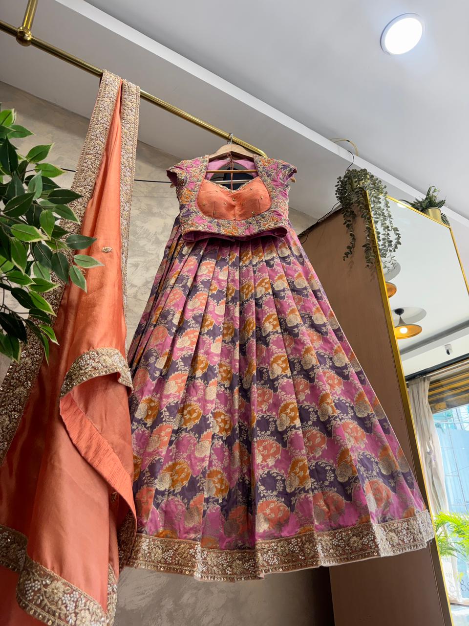 This beautiful outfit comes with heavy handwork done raw silk top along with a pure Banaras silk lehenga. The lehenga also comes with multiple border at the end. The dupatta is a pure dupion silk dupatta with handwork border added to it.