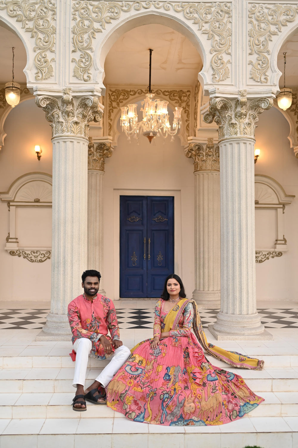 This is a couple set with Kalamkari lehenga and a Kurta set for Men.