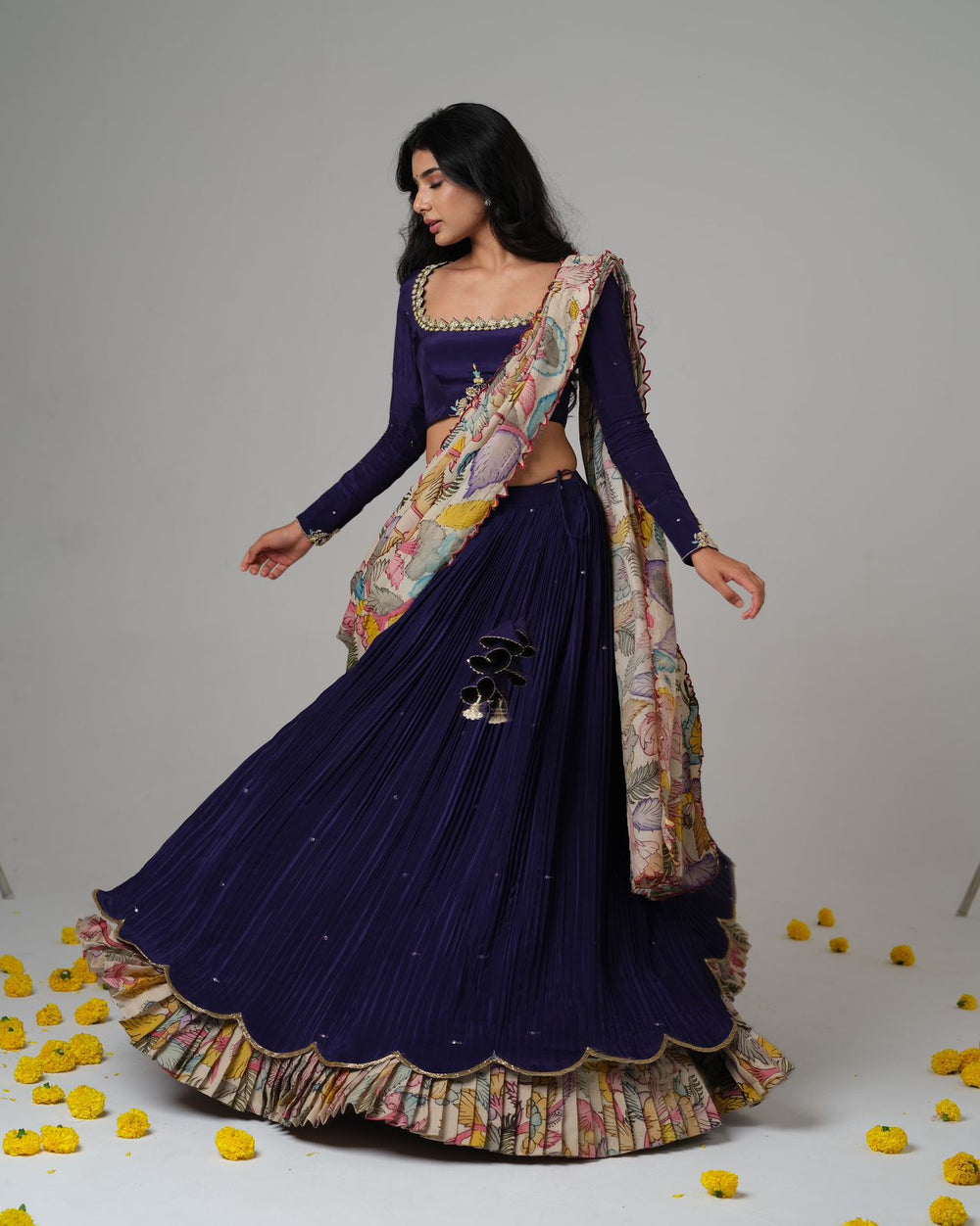This beautiful crop top lehenga comes with rich handwork on the top along with a rich natural crape silk lehenga. The dupatta is a pure pen hand painted kalamkari dupatta.