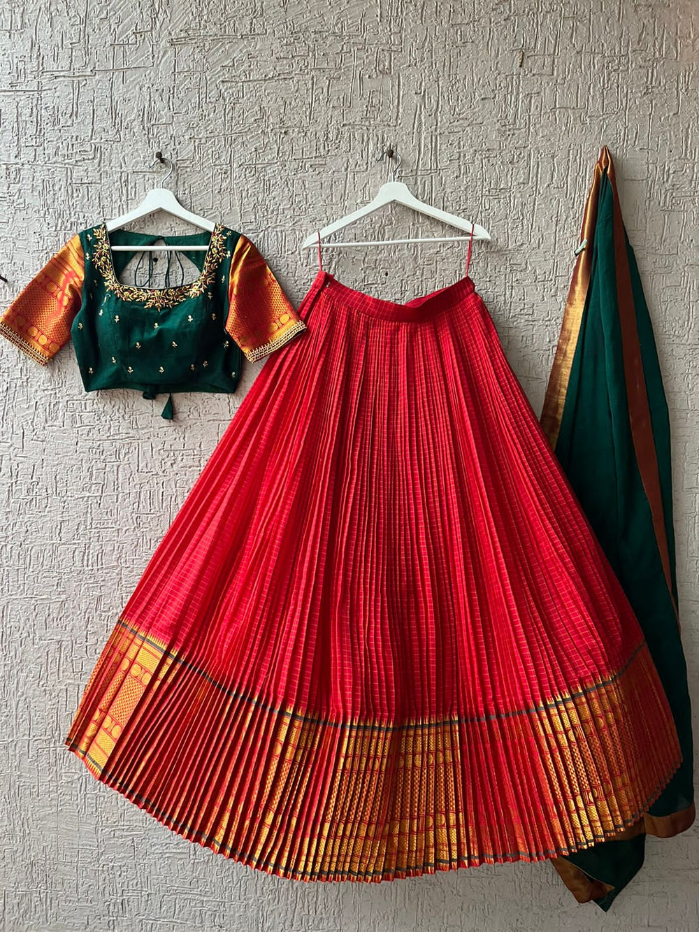 Our Green & Red Handloom Half Saree is designed and crafted by artists ensuring that traditional handloom products don't fade away. With its extensive range of color options, it's an ideal choice for any event. Half sarees have garnered global admiration for their versatility, allowing for different styles suitable for various occasions.