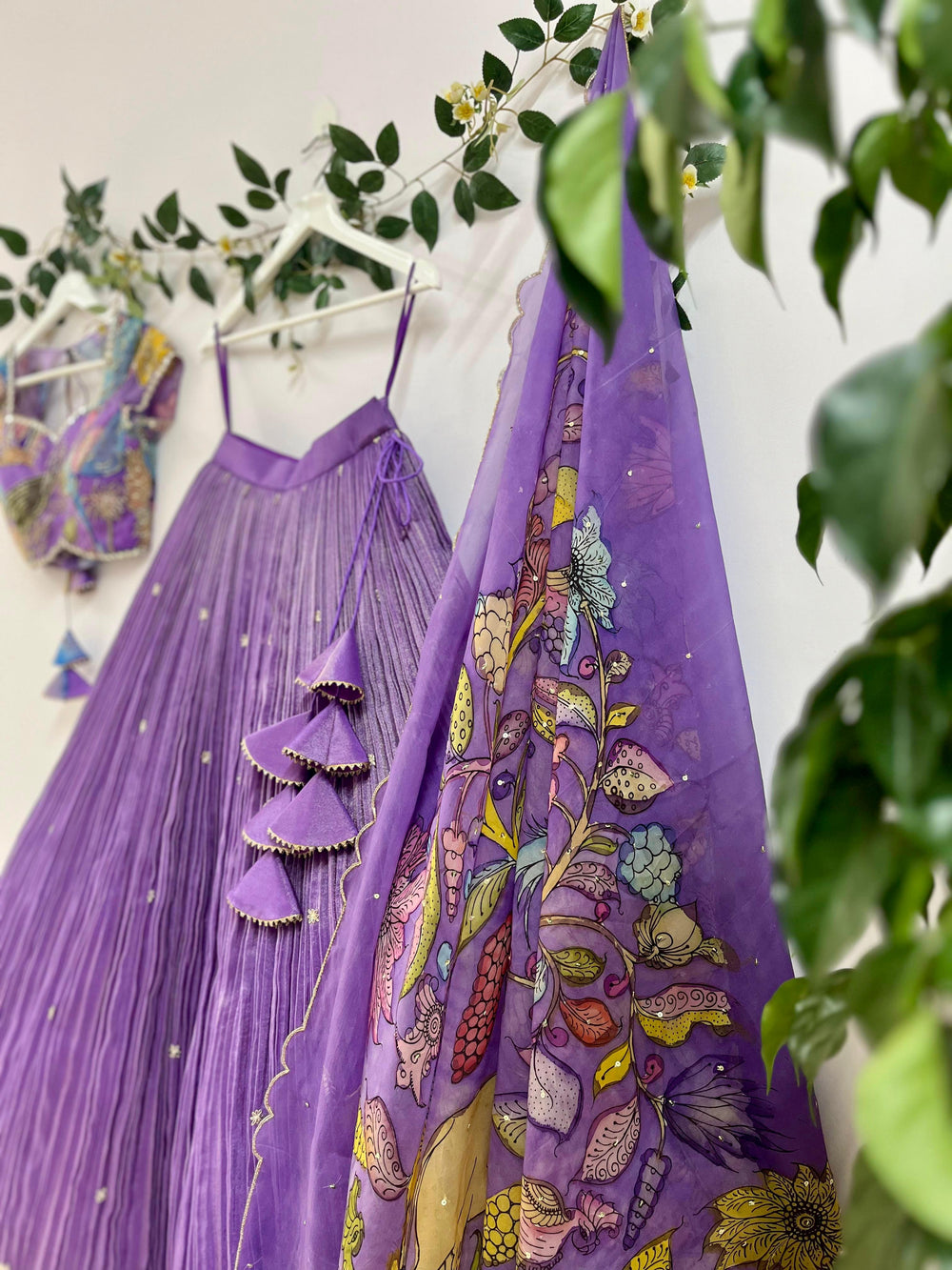 This beautiful crop top lehenga comes with complete heavy handwork done pen kalamkari top along with a rich tissue silk lehenga. The lehenga also comes with handwork on it and a curvy handwork border at the end. The dupatta is a pure hand painted pen kalamkari dupatta on viscose organza silk fabric.