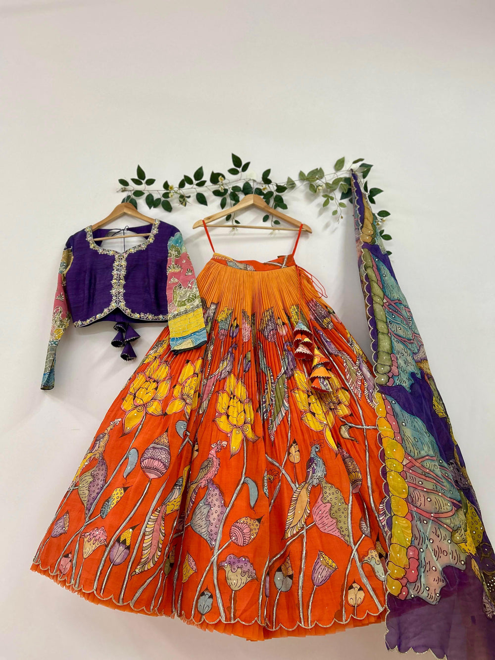 This outfit is a pure hand painted pen kalamkari done on a Bangalori silk fabric. It comes with a kalamkari top with complete handwork on it along with lehenga which also has handwork engraved on it. The dupatta is a pure hand painted pen kalamkari silk dupatta.
