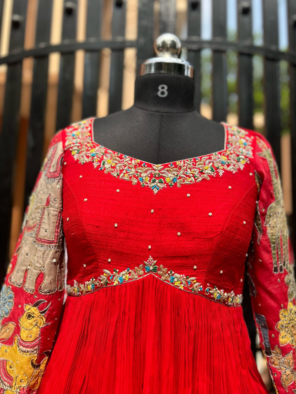 Kalamkari, an ancient art form renowned for its hand-painted or block-printed designs, is celebrated for its intricate detailing and vibrant colors. The Red Kalamkari Lehenga showcases this exquisite craftsmanship with its elaborate patterns, featuring motifs inspired by nature, mythology, and Indian folklore, all set against a rich red backdrop. This color not only symbolizes prosperity and joy but also adds a touch of royal elegance to the attire.