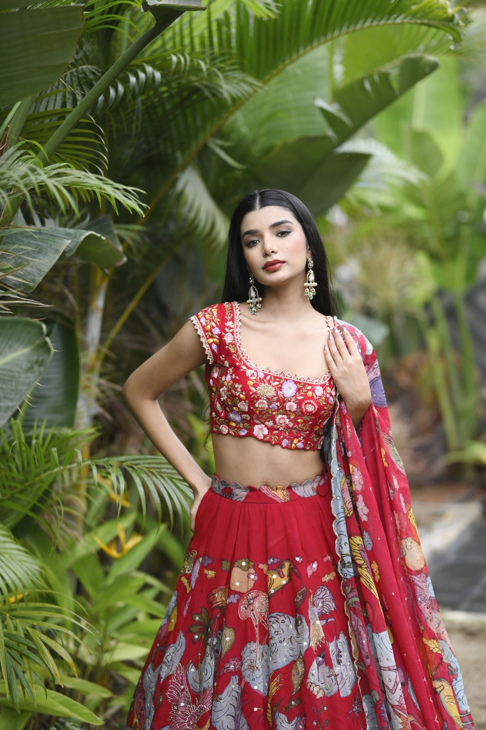 This outfit is a pure hand painted pen kalamkari done on a Organza silk fabric. It comes with a top with complete handwork on it along with lehenga which also has handwork engraved on it. The dupatta is a pure hand painted pen kalamkari dupatta.