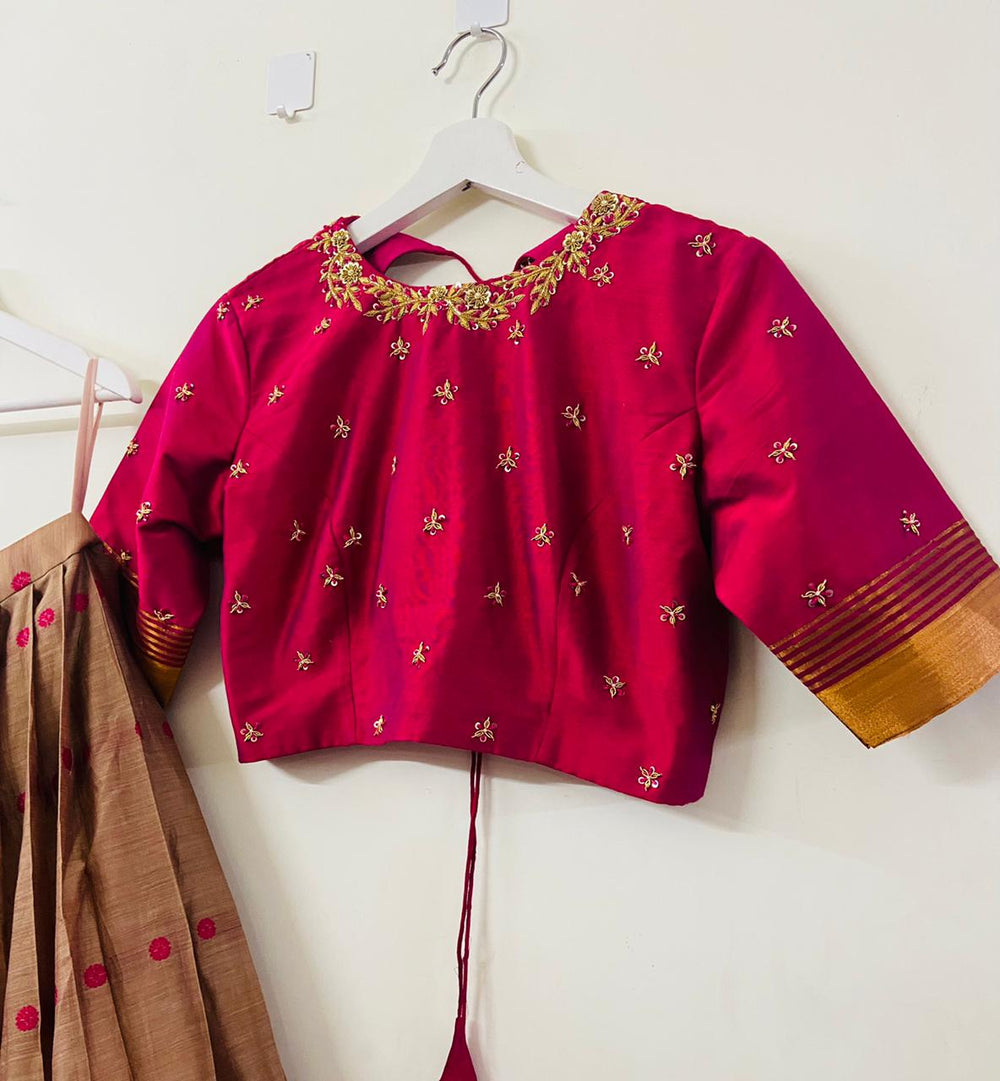 Narayanpet Semi silk lehenga with maggam work on top. This bright-colored beautiful lehenga is going to be a go-to pick for any festive occasion.