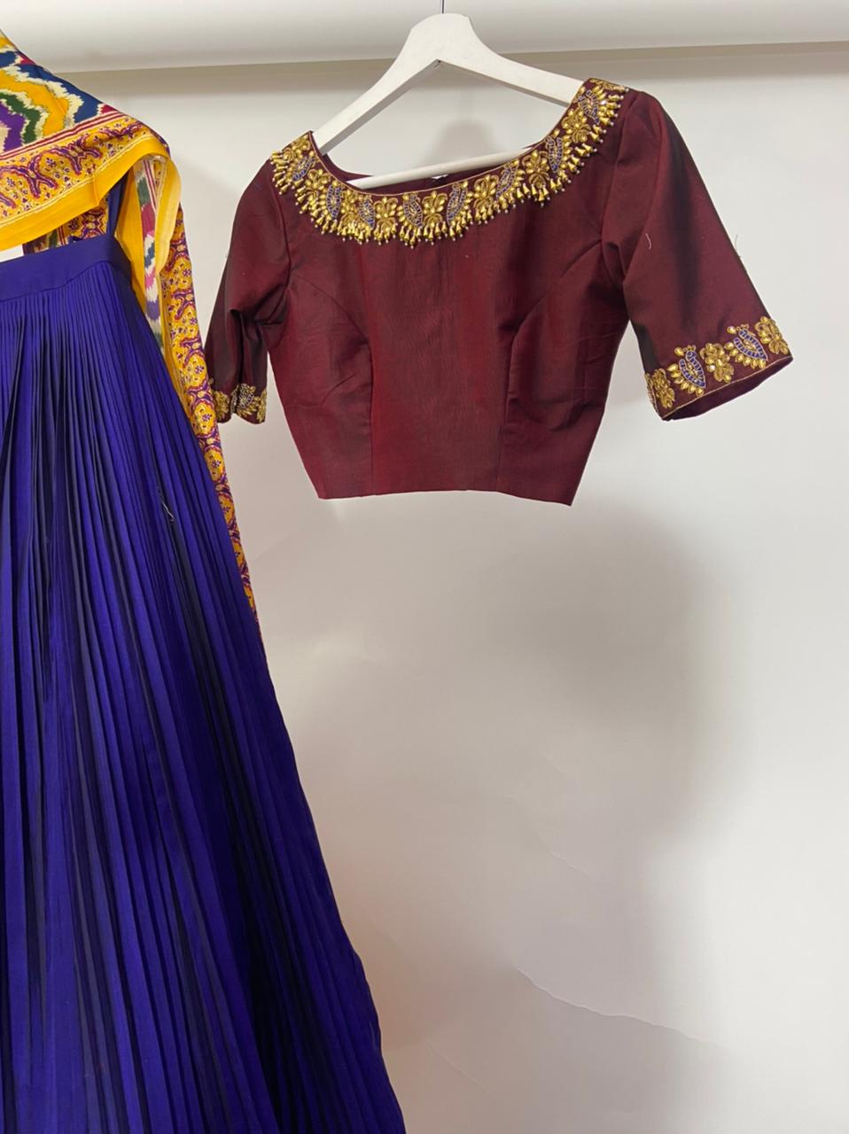 This outfit is made from pure silk handloom fabric. Maroon top with handwork on front neck. Blue color lehenga with silk border. The dupatta is a multicolor flowy silk dupatta. This bright-colored beautiful lehenga is going to be a go-to pick for any festive occasion.Â