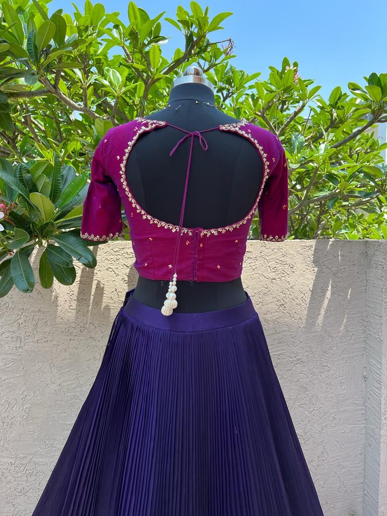 This outfit is made from pure silk handloom fabric. Purple top with handwork on front and back neck along with sleeves. Blue color lehenga with silk border. The dupatta is a chanderi silk bandani dupatta. This bright-colored beautiful lehenga is going to be a go-to pick for any festive occasion.Â