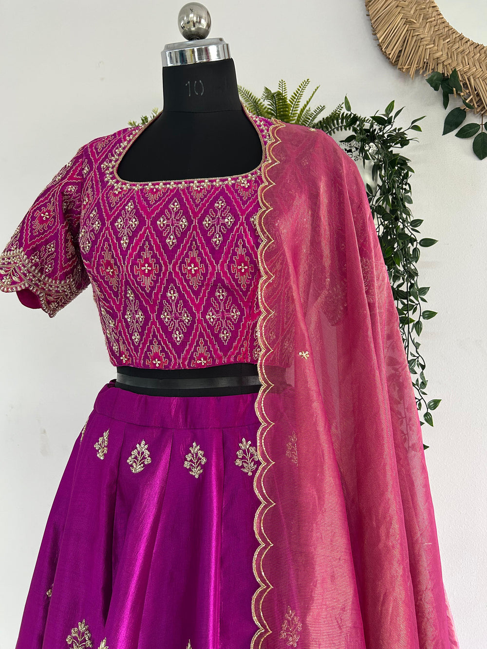 This beautiful crop top lehenga comes with pure Ikkat silk handwork top. The lehenga is made of pure dupion silk with complete handwork done on it. The dupatta is a pure tissue silk dupatta.