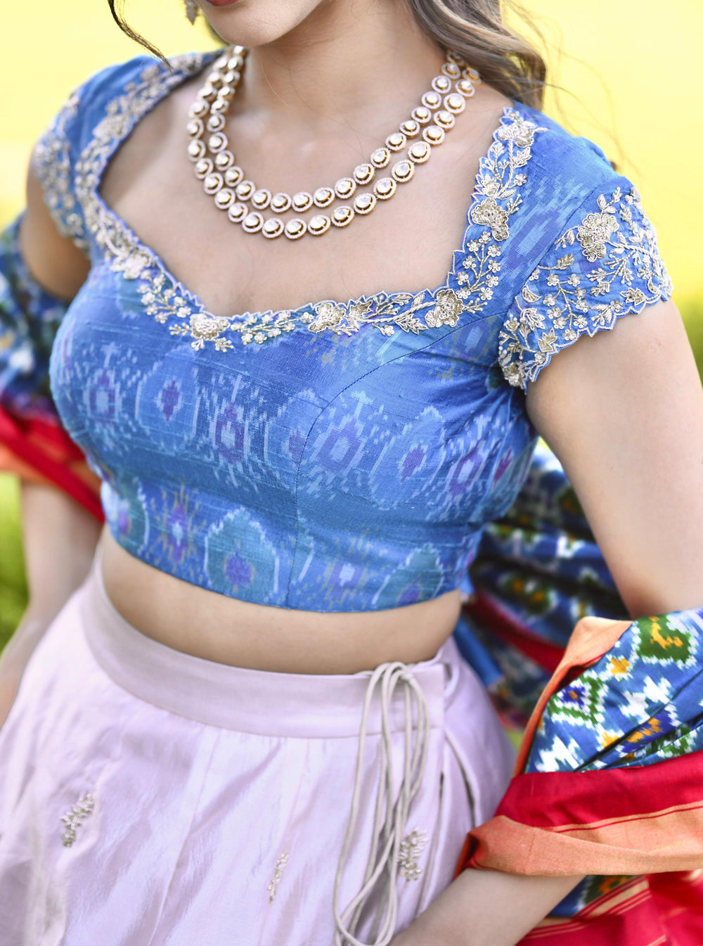 This beautiful crop top lehenga comes with pure Ikkat silk handwork top. The lehenga is made of pure dupion silk with complete handwork done on it. The dupatta is a pure ikkat silk dupatta.